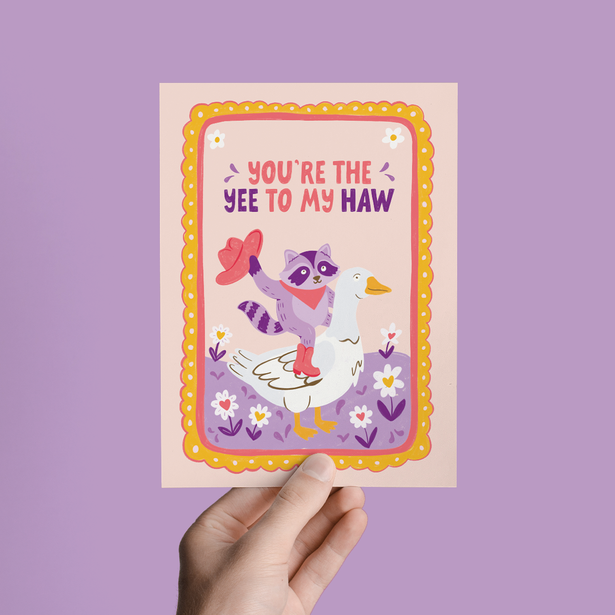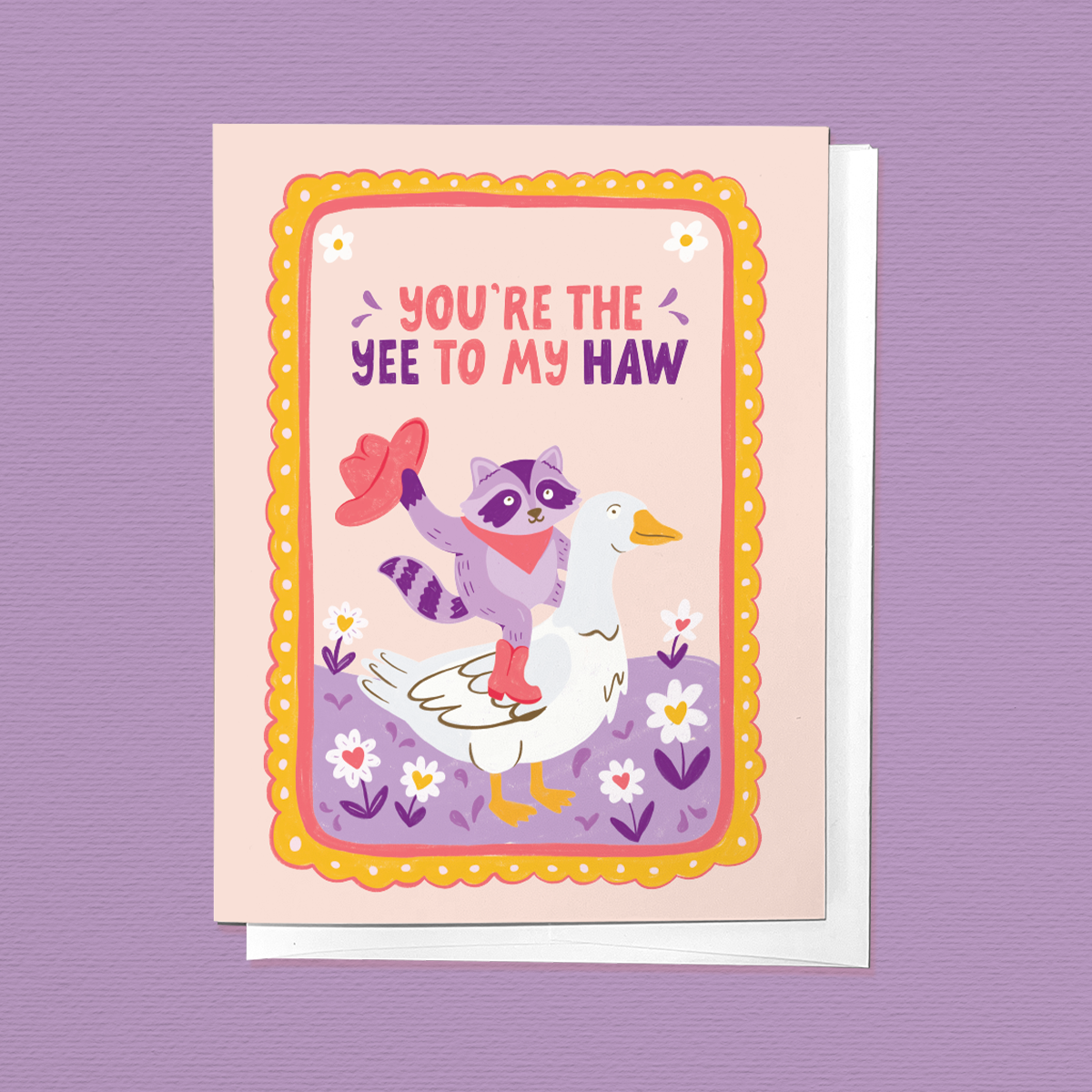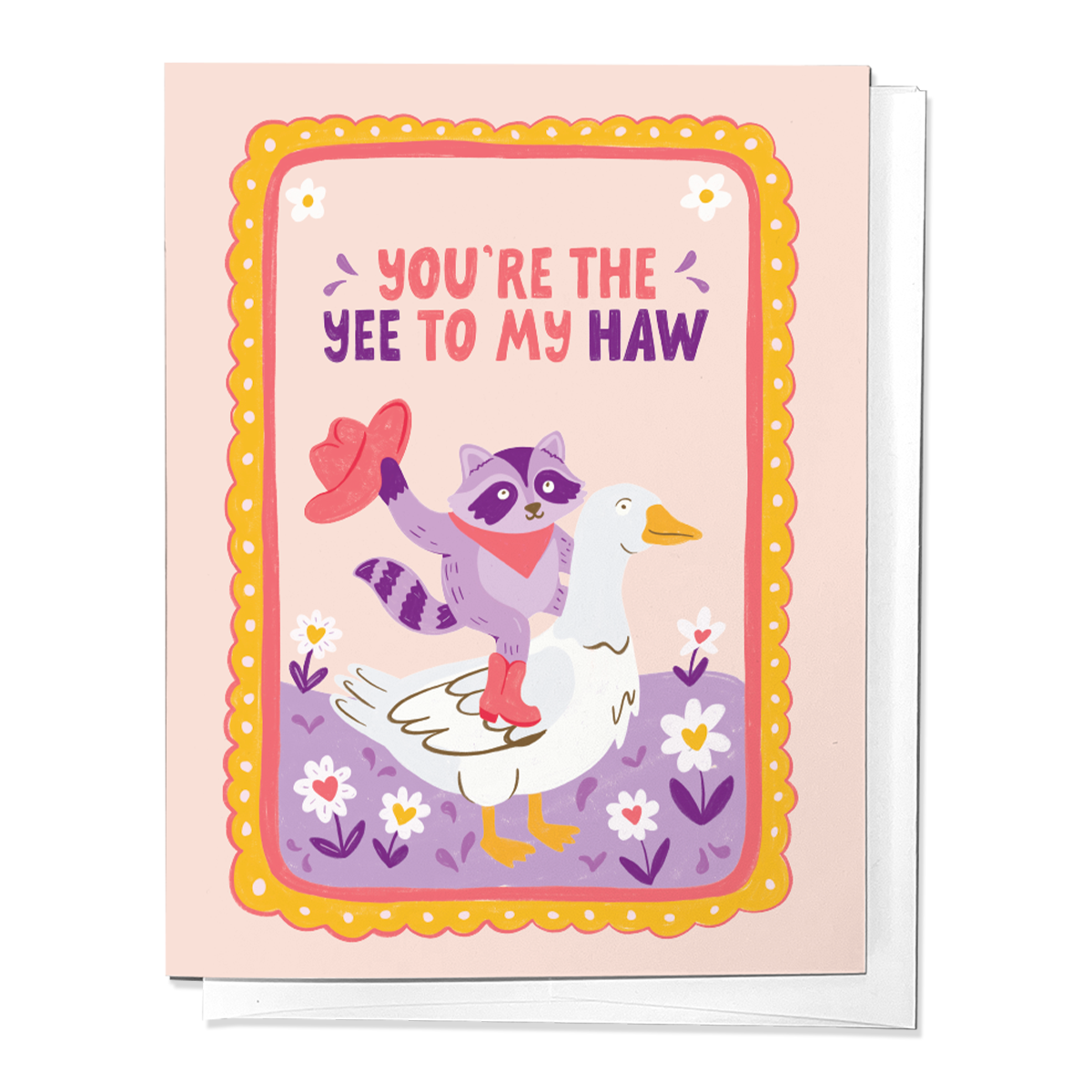 This greeting card features illustrations a cute cowboy raccoon riding a goose with the phrase "You're the Yee to my Haw"