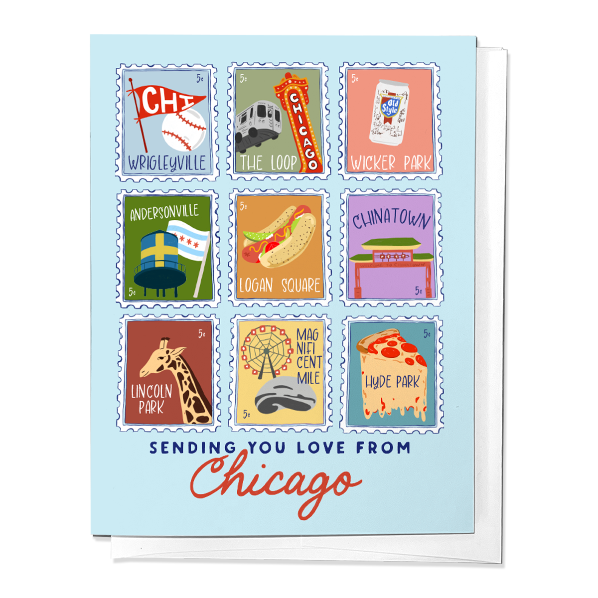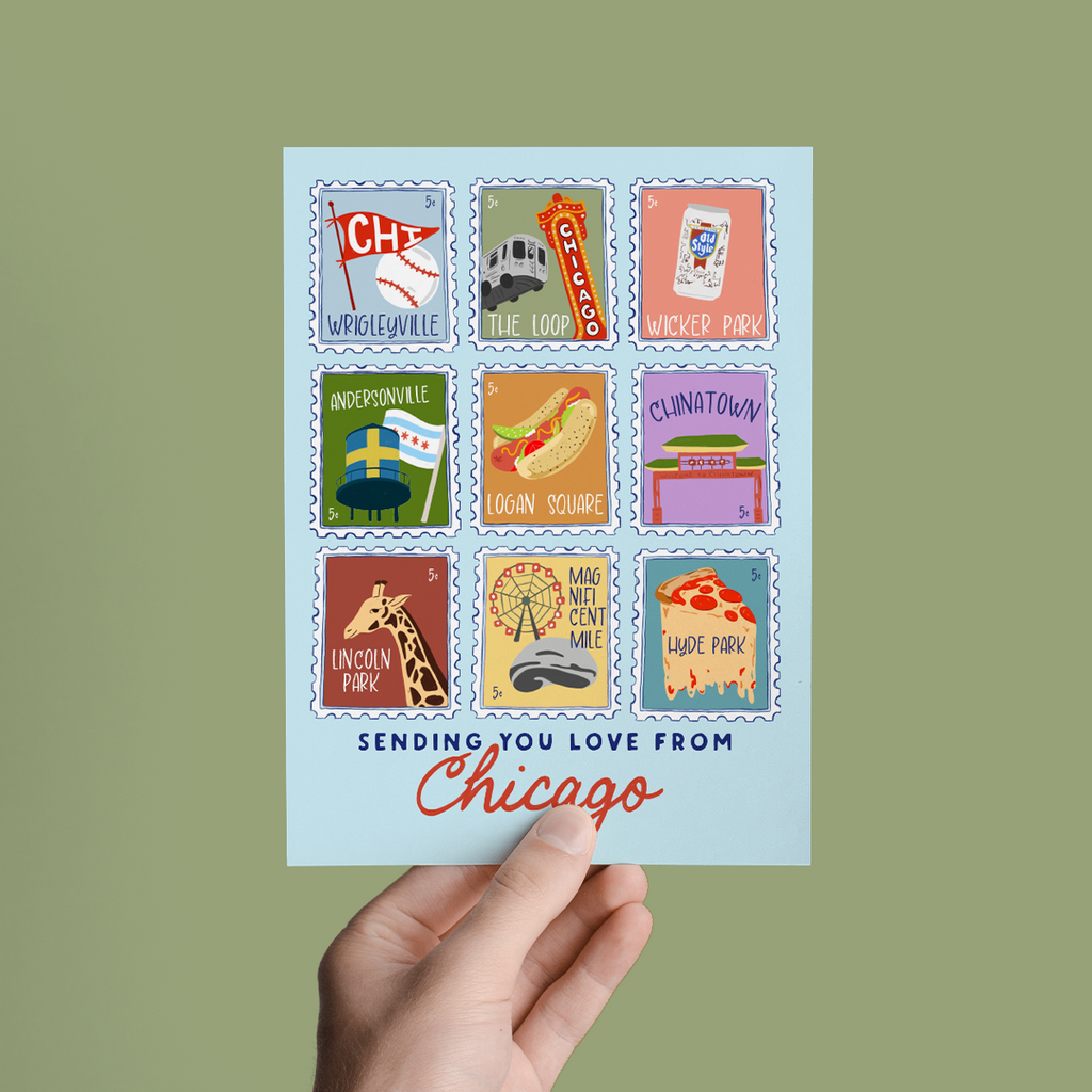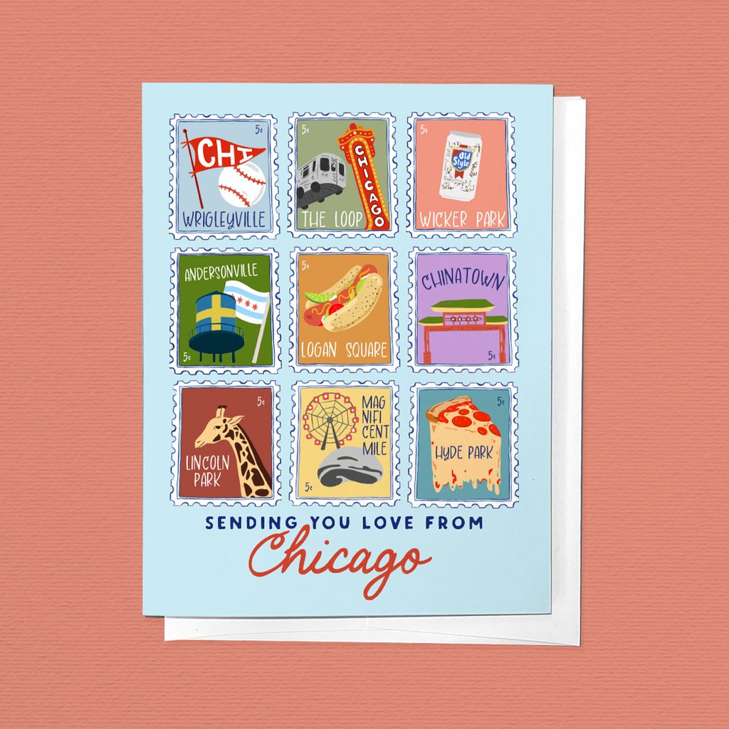 Sending love from the windy city! Remind those of why Chicago is the best city by sharing this greeting card that's filled with Chicago staples. From Chicago Deep Dish to Neighborhoods of Chicago, this card is perfect for Chicago Lovers.