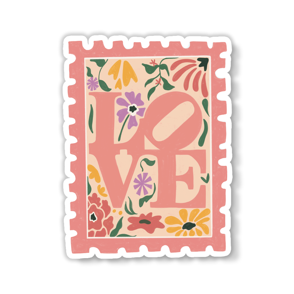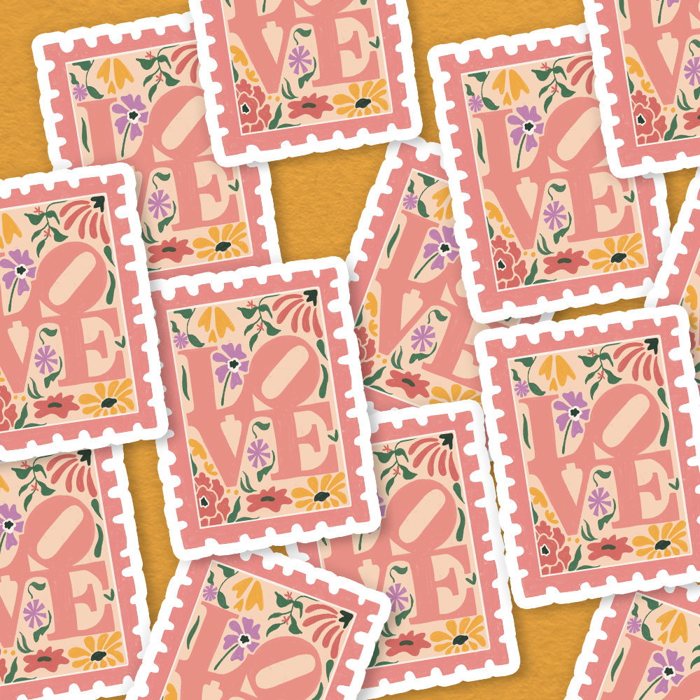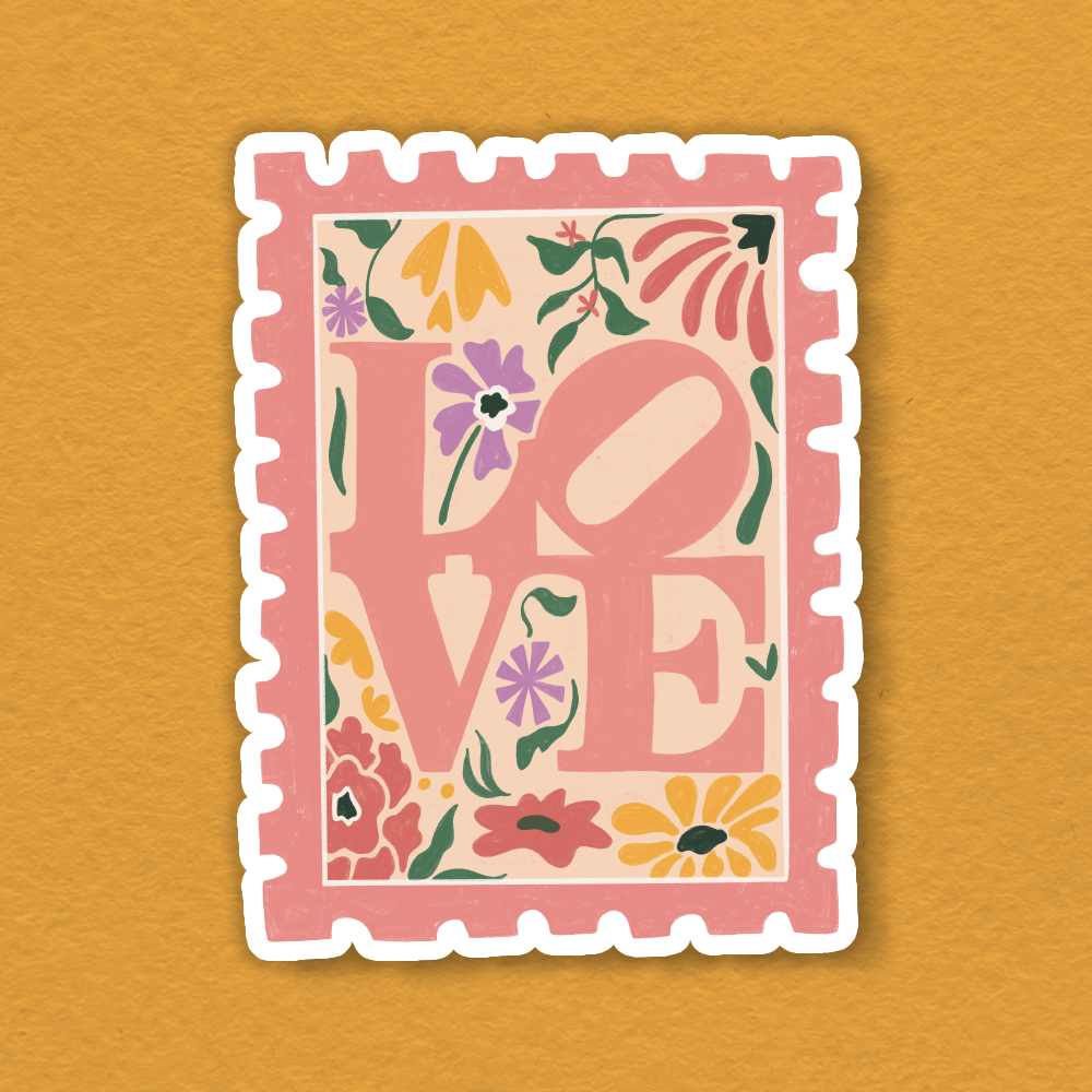 This sticker is perfect for Philadelphia fans! This sticker is an illustration of the LOVE park sign inside a stamp with floral decorations around