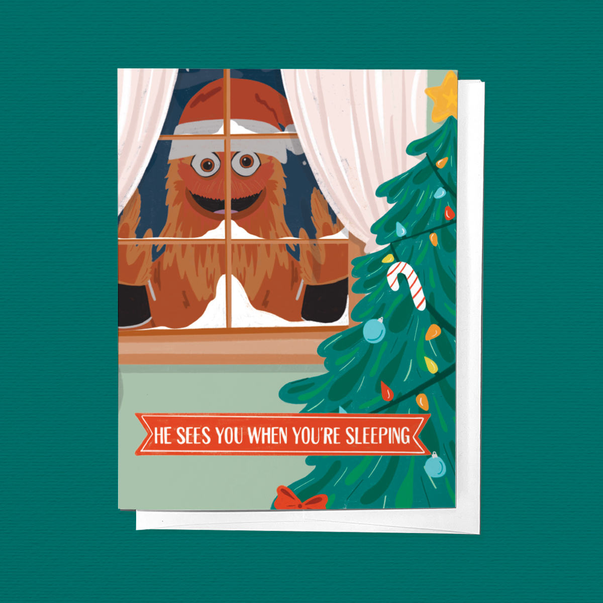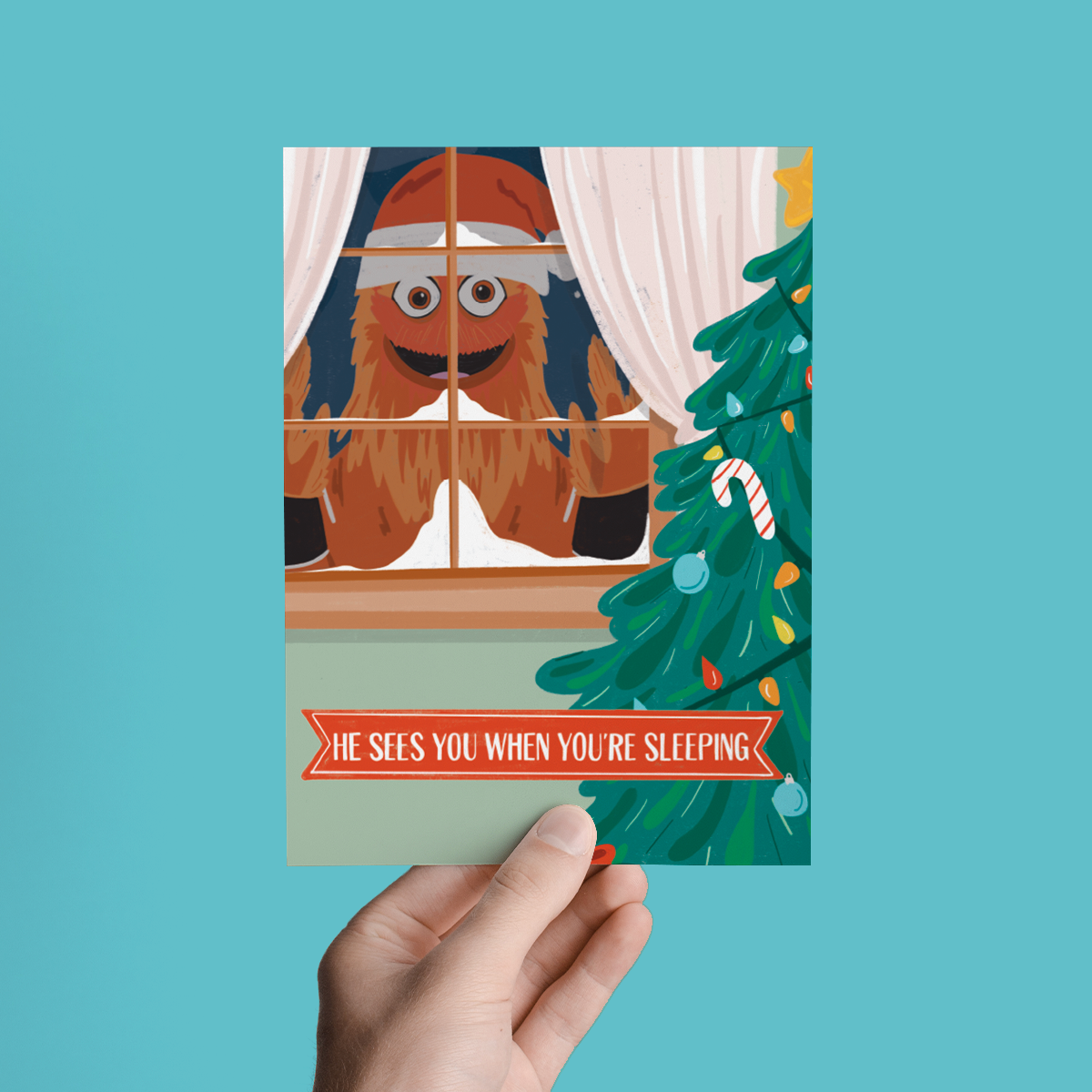 He sees you when you're sleeping, Gritty Clause is here for the Holidays! This greeting cards features an illustration of the NHL Flyers Hockey Mascot Gritty, looking into the window of a Christmas Living Room, with the phrase "He Sees You When You're Sleeping"
